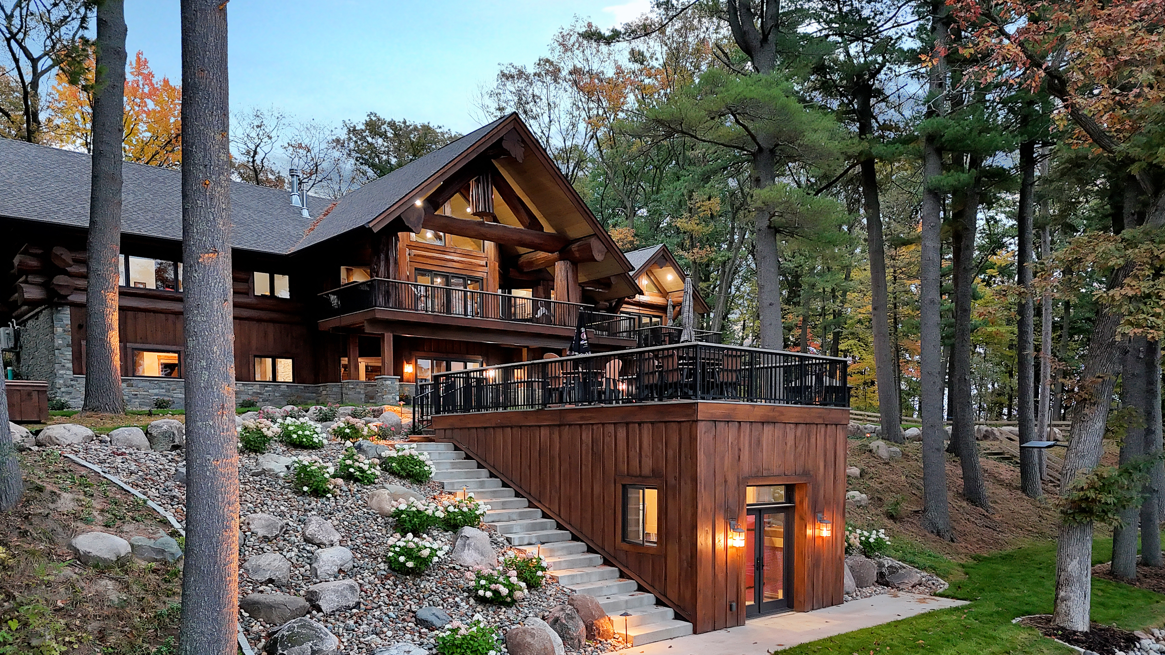 A custom log home designed to feel grounded in its wooded setting while offering modern comfort and scale. Natural materials, layered outdoor spaces, and thoughtful siting create a home that feels both substantial and inviting.