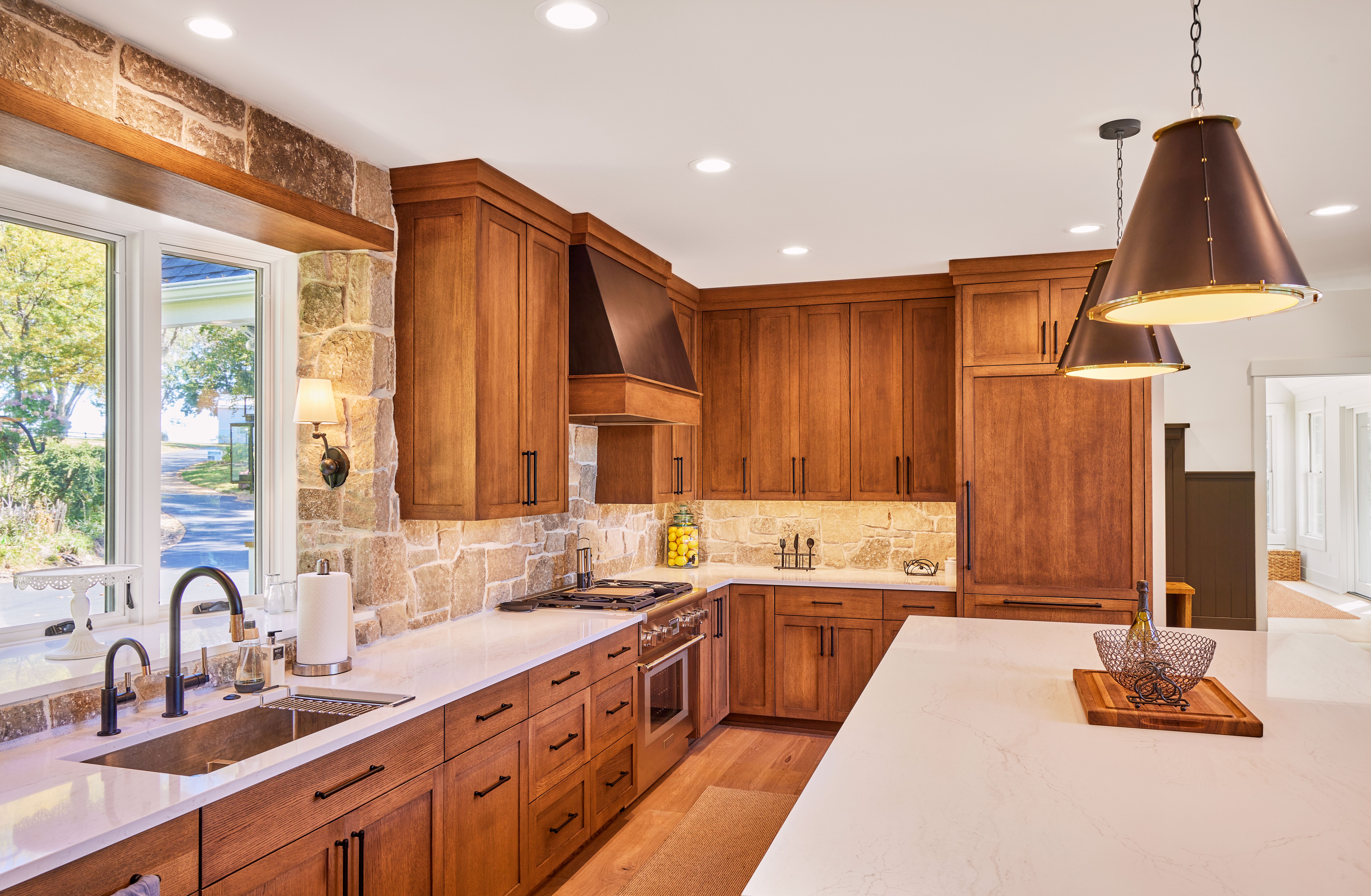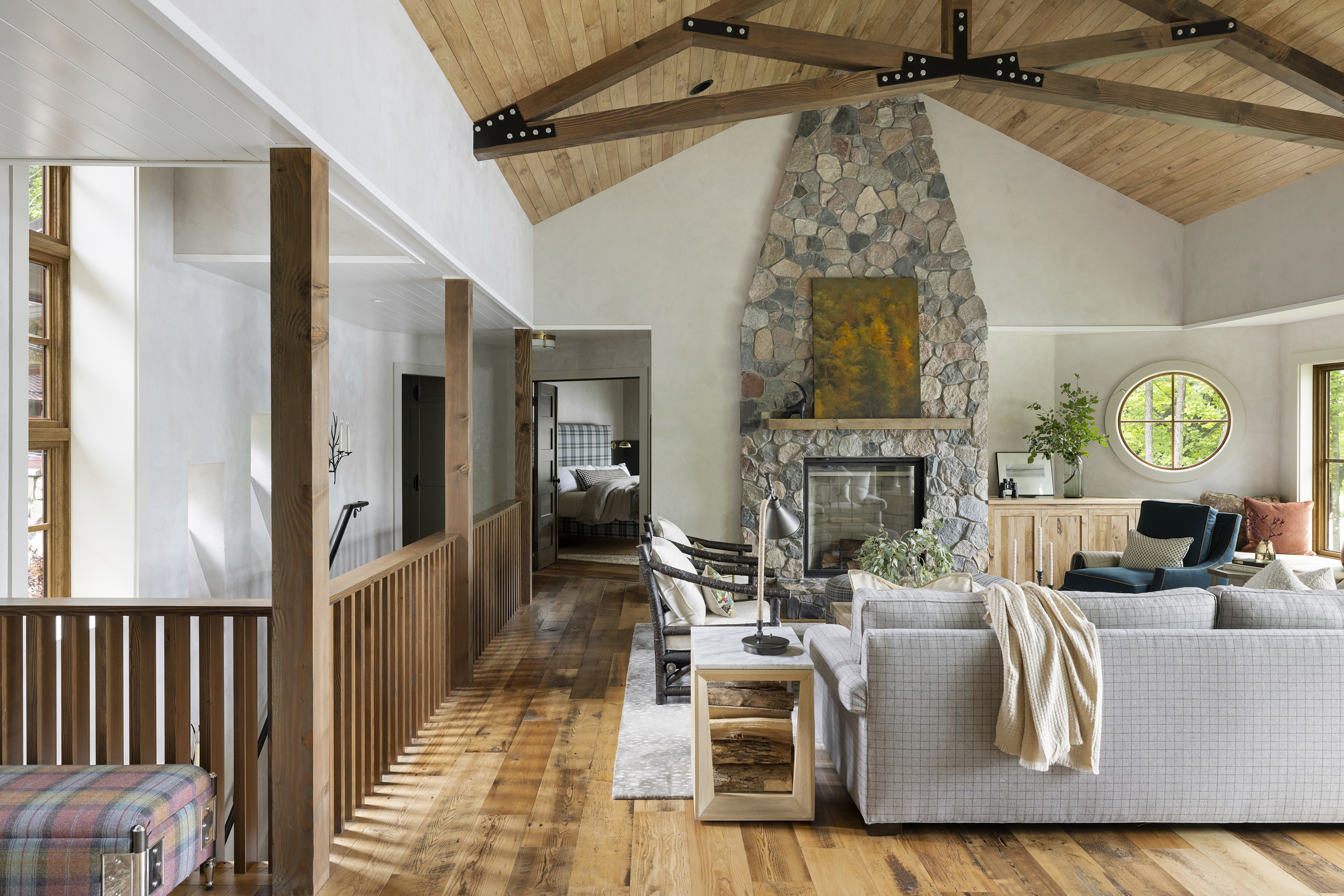 A warm, inviting lake home that balances natural textures with refined interior details. Vaulted ceilings, exposed structure, and layered finishes create spaces that feel both elevated and comfortable — designed for everyday living and effortless gathering.