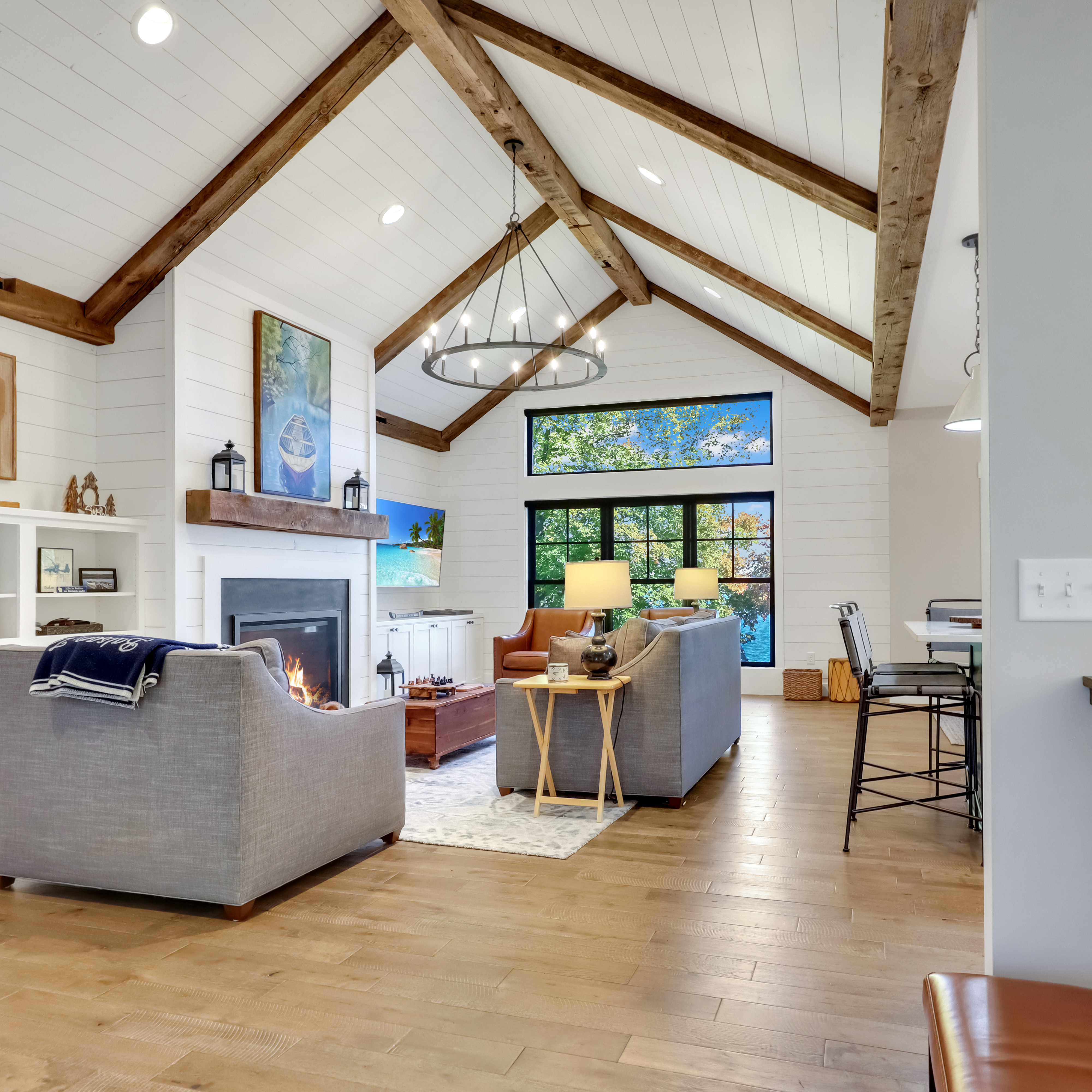 A new lake home designed around rustic beams, natural textures, and a calm, comfortable aesthetic. Exposed timbers, warm wood tones, and thoughtful detailing create a space that feels grounded, inviting, and built to last.